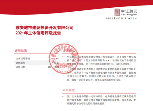 2021年12月23日,中證鵬元資信評估股份有限公司正式出具評級報告,將城投公司主體信用等級評定為AA。