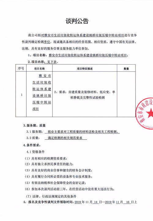 雅安市生活垃圾轉(zhuǎn)運(yùn)體系建設(shè)姚橋垃圾壓縮中轉(zhuǎn)站項(xiàng)目競爭性談判公告