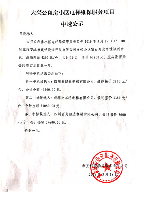 大興公租房小區(qū)電梯維護(hù)服務(wù)項(xiàng)目中選公示