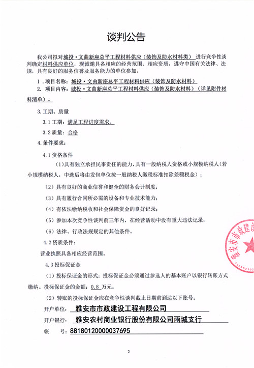 城投·文曲新座總平工程材料供應(裝飾及防水材料類)競爭性談判公告