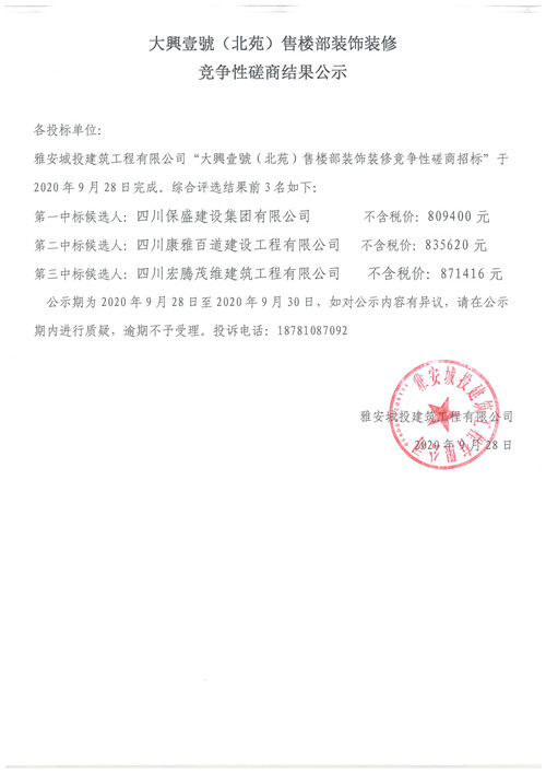 大興壹號(北苑)售樓部裝飾裝修競爭性磋商結果公示
