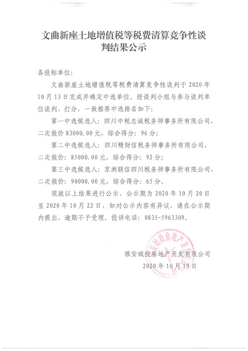 文曲新座土地增值稅等稅費清算競爭性談判結果公示