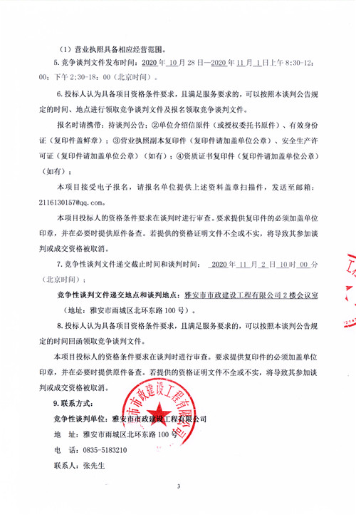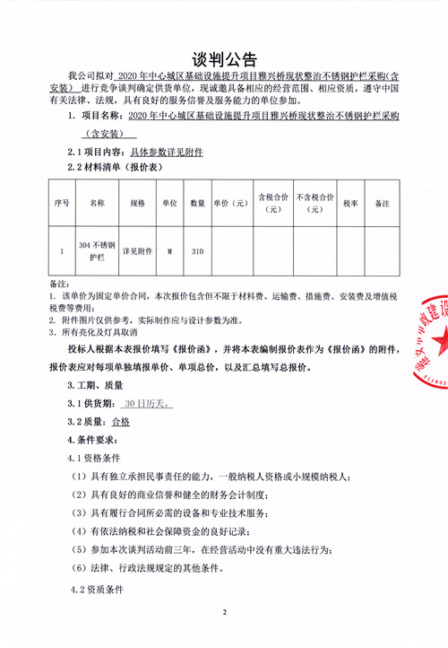 市政公司2020年中心城區(qū)基礎(chǔ)設(shè)施提升項目雅興橋現(xiàn)狀整治不銹鋼護欄采購(含安裝)競爭性談判公告