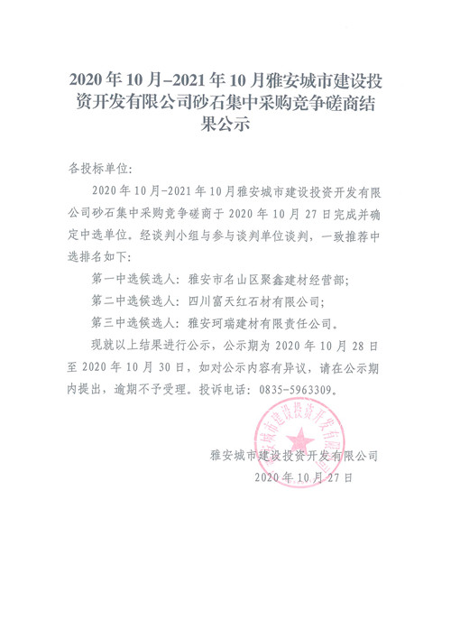 2020年10月-2021年10月雅安城市建設投資開發(fā)有限公司砂石集中采購競爭磋商結果公示