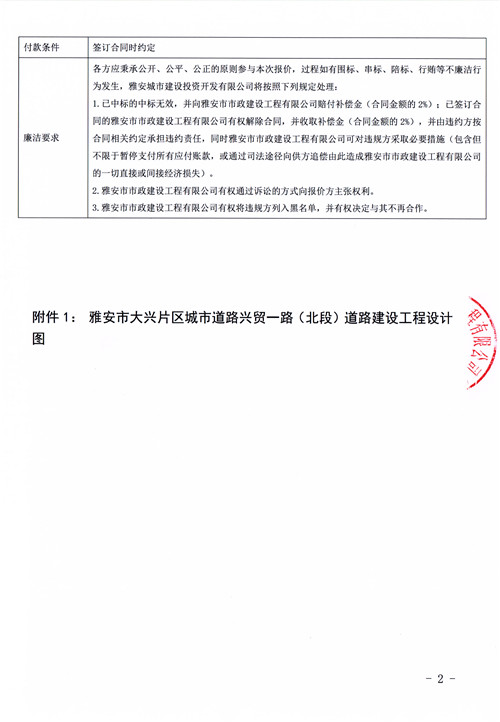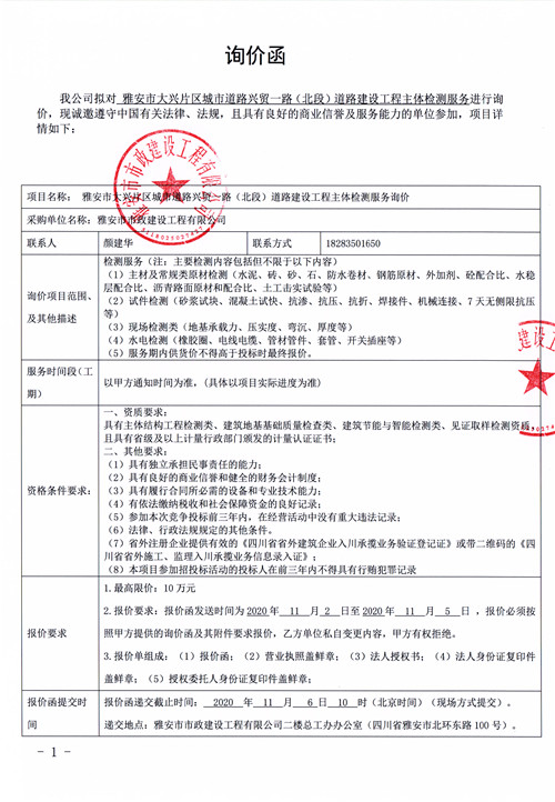 雅安市大興片區(qū)城市道路興貿(mào)一路(北段)道路建設(shè)工程主體檢測(cè)服務(wù)詢價(jià)函