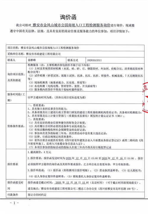 雅安市金鳳山城市公園南坡入口工程檢測服務(wù)詢價(jià)函