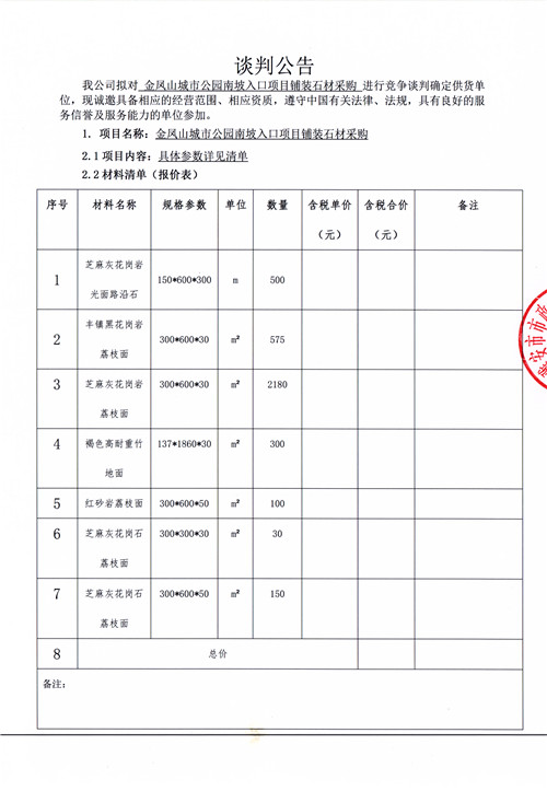 金鳳山城市公園南坡入口項(xiàng)目鋪裝石材采購競爭性談判公告
