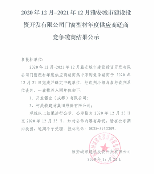 2020年12月-2021年12月雅安城市建設(shè)投資開發(fā)有限公司門窗型材年度供應(yīng)商磋商競爭磋商結(jié)果公示
