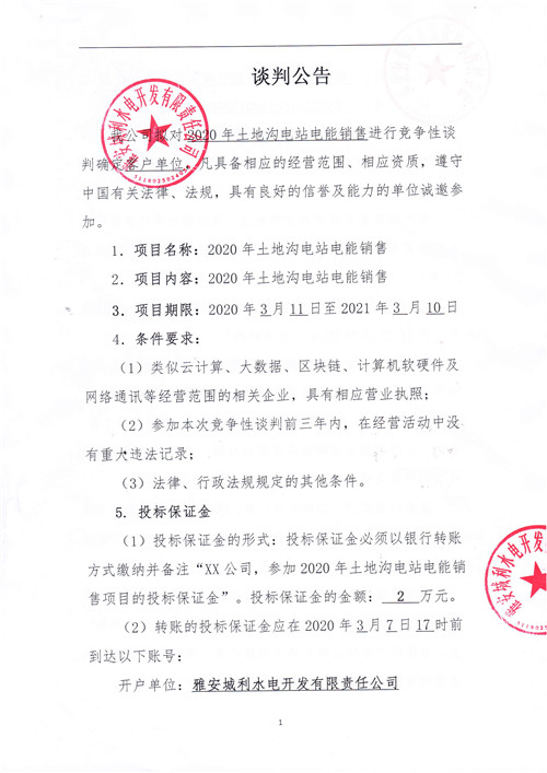 2020年土地溝電站電能銷(xiāo)售競(jìng)爭(zhēng)性談判公告