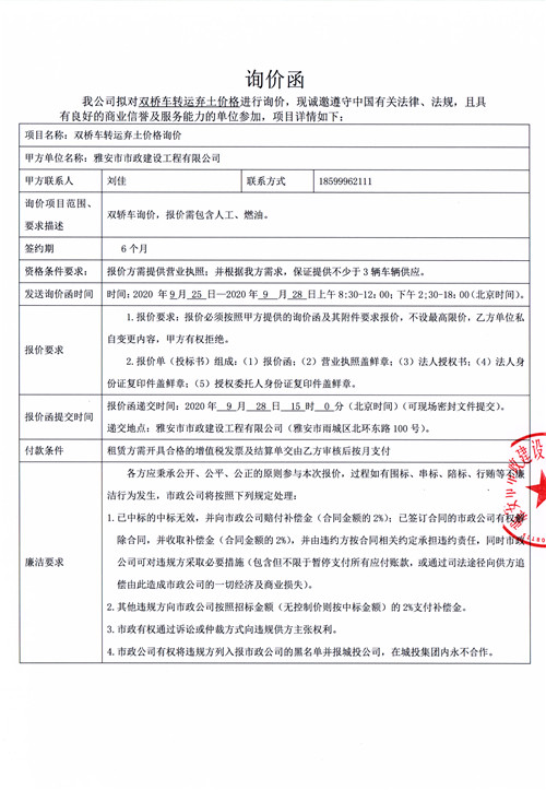 市政公司雙橋車轉(zhuǎn)運(yùn)棄土價格詢價函