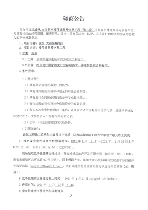 雅安城投房地產(chǎn)開發(fā)有限公司城投·文曲新座樓頂拆除及恢復(fù)工程(第二次)競爭性磋商公告