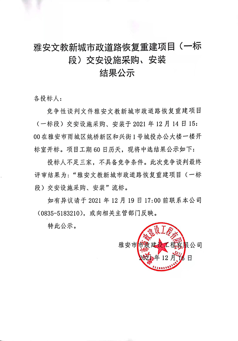 雅安文教新城市政道路恢復(fù)重建項(xiàng)目(一標(biāo)段)交安設(shè)施采購、安裝結(jié)果公示