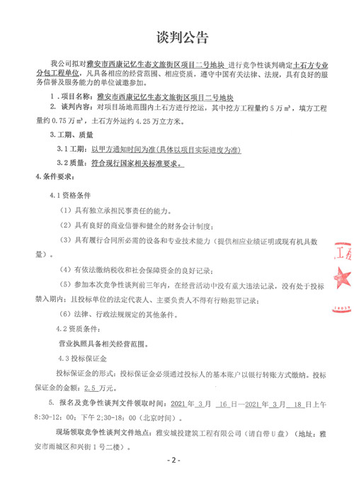 城投建工公司雅安市西康記憶生態(tài)文旅街區(qū)項(xiàng)目二號(hào)地塊土石方專業(yè)分包工程競(jìng)爭(zhēng)性談判公告