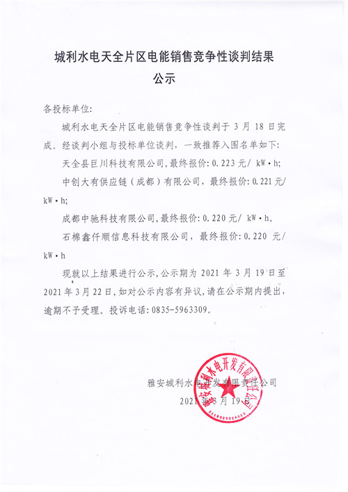 城投水電公司天全片區(qū)電站電能銷售競(jìng)爭(zhēng)性談判結(jié)果公示