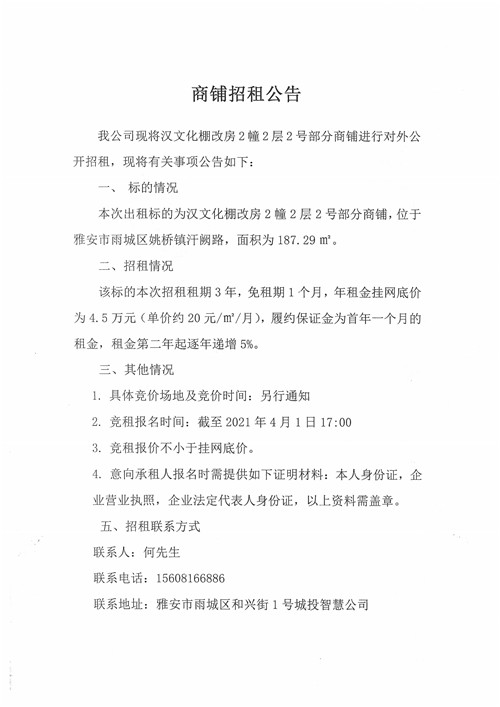 漢文化棚改房2幢2層2號(hào)部分商鋪招租公告