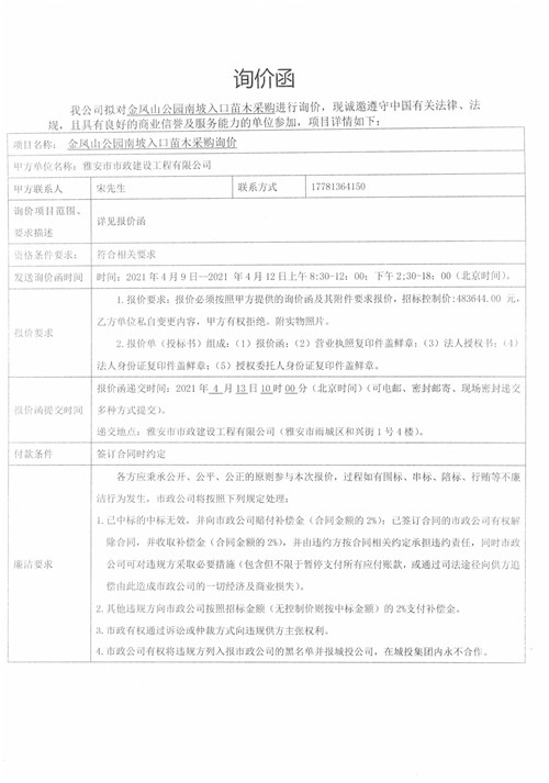 雅安市政公司金鳳山公園南坡入口苗木采購(gòu)詢(xún)價(jià)函