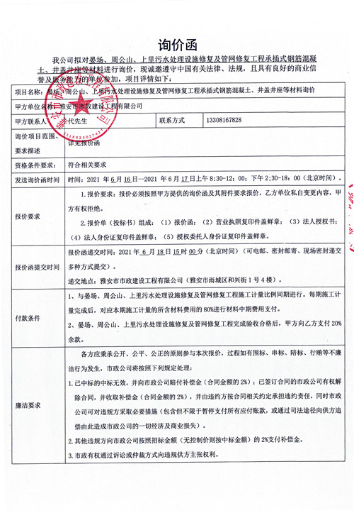 雅安城投市政公司晏場(chǎng)、周公山、上里污水處理設(shè)施修復(fù)及管網(wǎng)修復(fù)工程承插式鋼筋混凝土、井蓋井座等材料詢(xún)價(jià)函