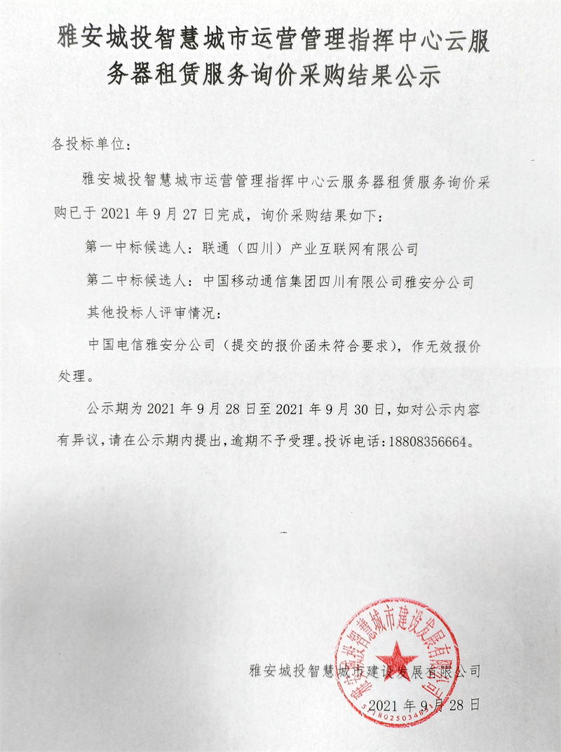 雅安城投智慧城市運(yùn)營管理指揮中心云服務(wù)器租賃服務(wù)采購詢價(jià)結(jié)果公示