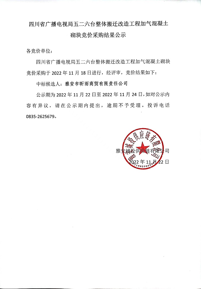 四川省廣播電視局五二六臺整體搬遷改造工程加氣混凝土砌塊競價采購結(jié)果公示
