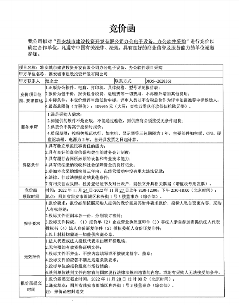 雅安城市建設(shè)投資開發(fā)有限公司辦公電子設(shè)備、辦公軟件項目采購競價公告
