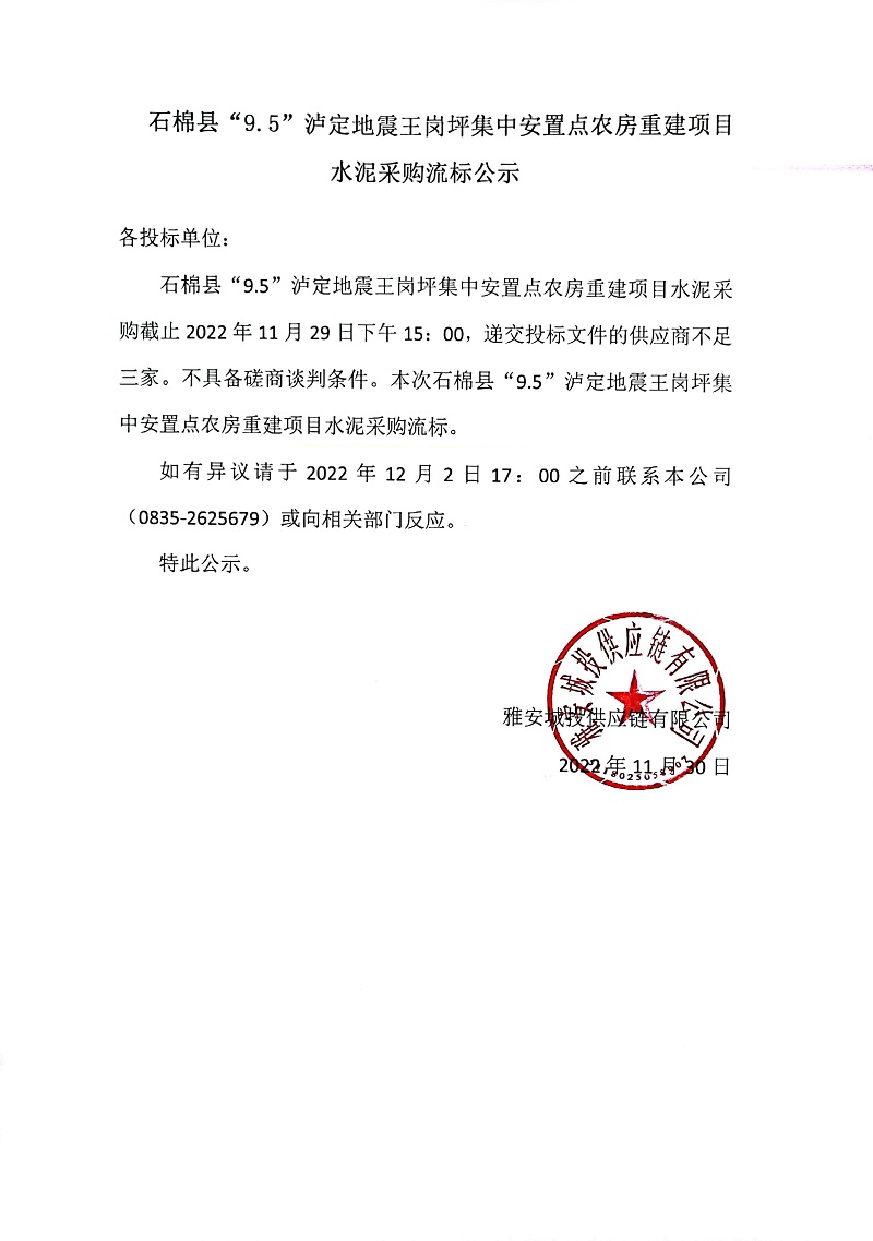 石棉縣“9.5”瀘定地震王崗坪集中安置點農(nóng)房重建項目水泥采購流標公示