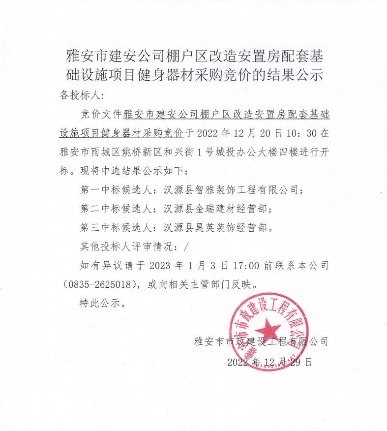 雅安市建安公司棚戶區(qū)改造安置房配套基礎(chǔ)設(shè)施項目健身器材采購競價結(jié)果公示