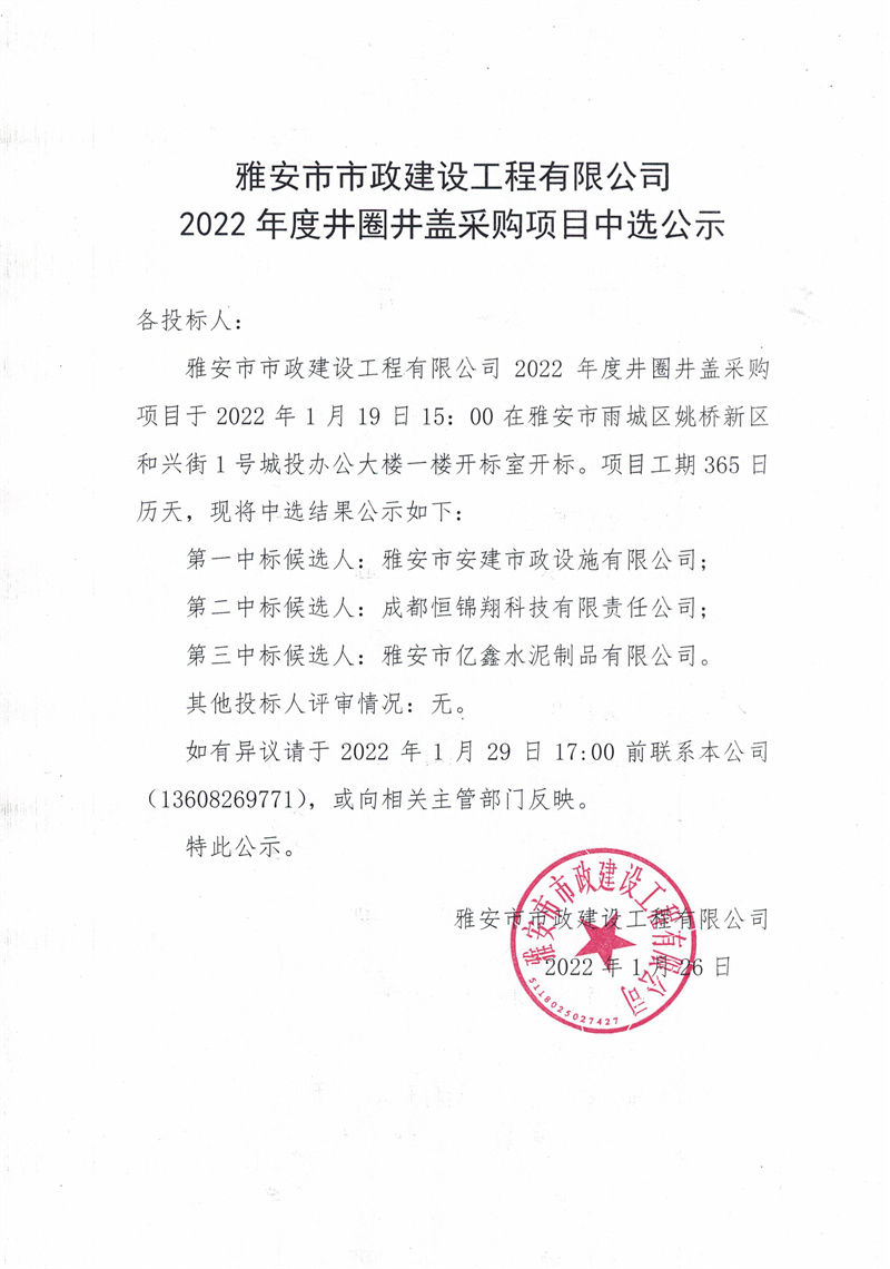 雅安市市政建設(shè)工程有限公司2022年度井圈井蓋采購(gòu)項(xiàng)目中選公示
