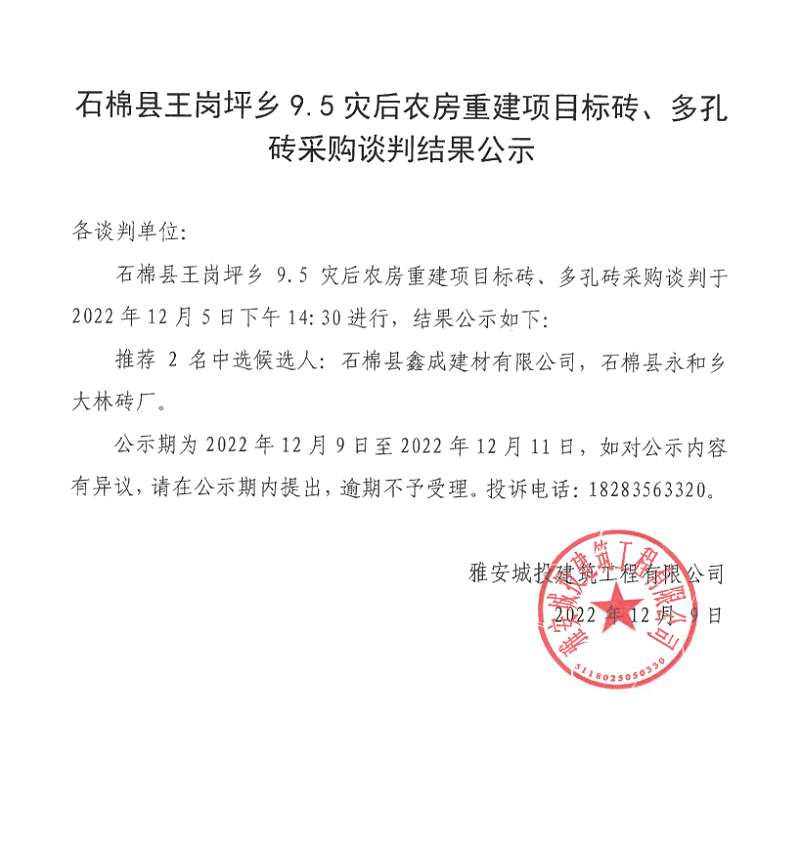 石棉縣王崗坪鄉(xiāng)9.5災(zāi)后農(nóng)房重建項(xiàng)目標(biāo)磚、多孔磚采購(gòu)談判結(jié)果公示