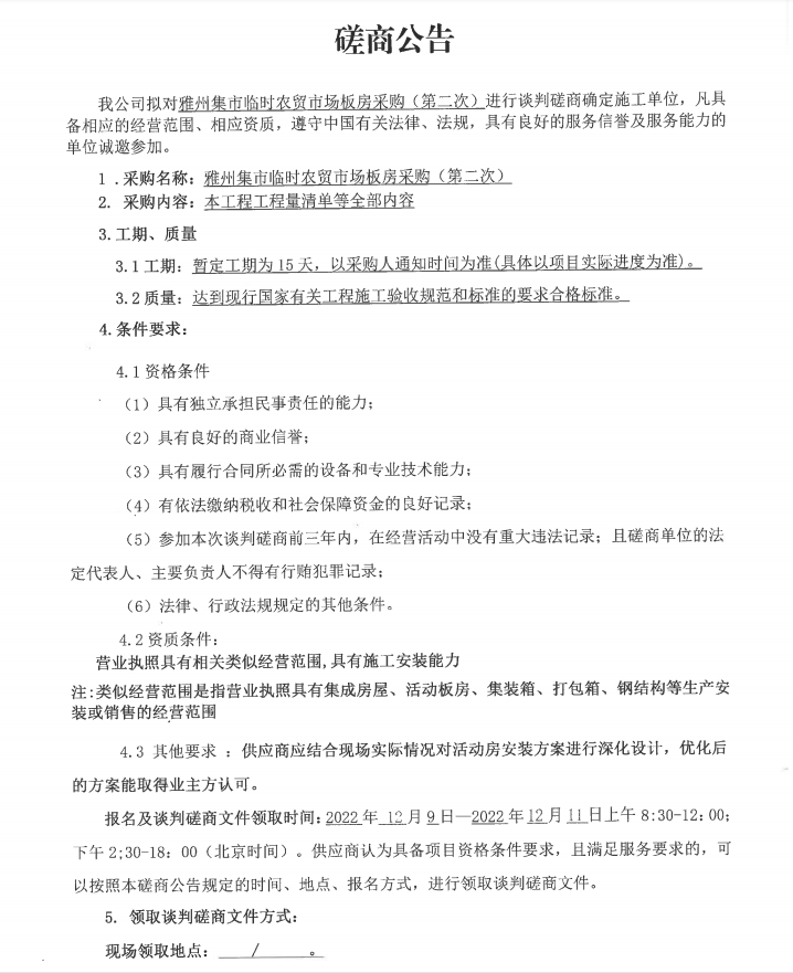 雅州集市臨時(shí)農(nóng)貿(mào)市場板房采購(第二次)磋商公告