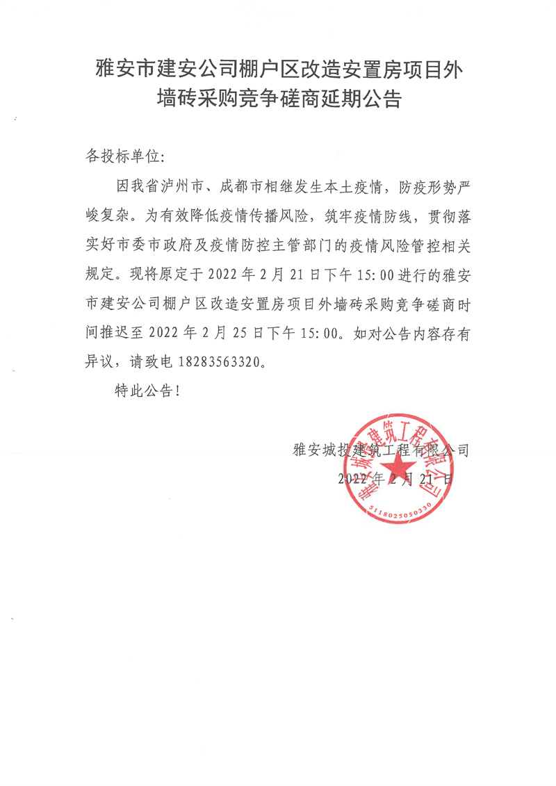 雅安市建安公司棚戶區(qū)改造安置房項(xiàng)目外墻磚采購競(jìng)爭(zhēng)磋商延期公告