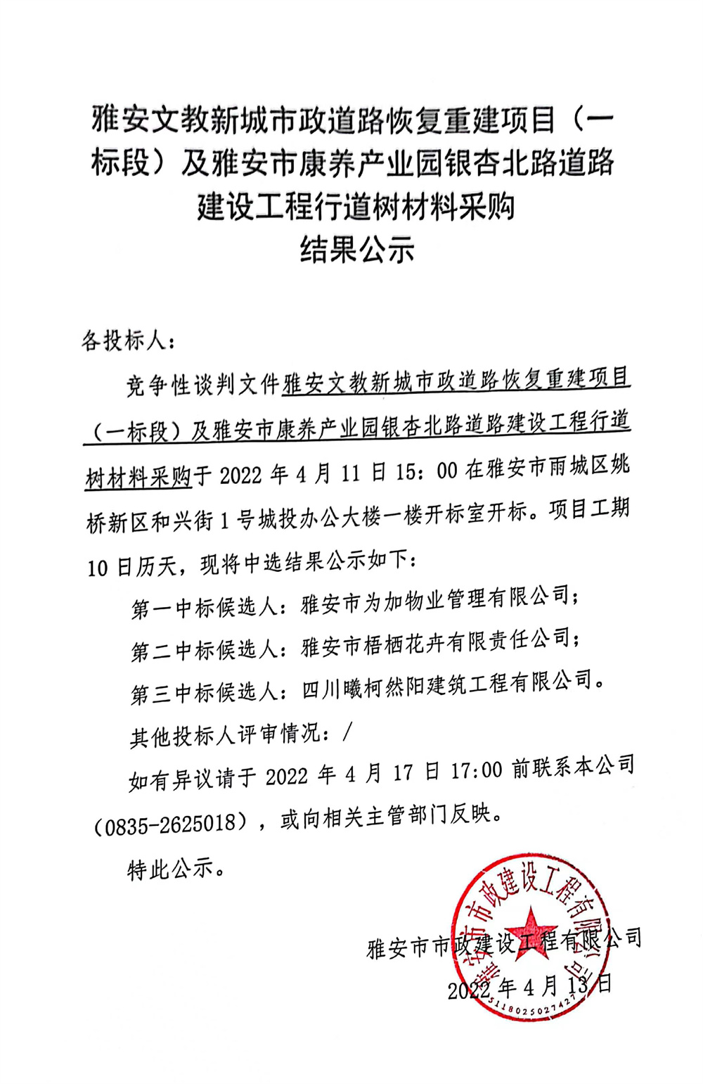雅安文教新城市政道路恢復重建項目(一標段)及雅安市康養(yǎng)產(chǎn)業(yè)園銀杏北路道路建設(shè)工程行道樹材料采購結(jié)果公示