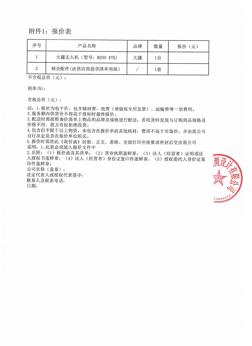 黎明勘測公司購買大疆無人機(jī)(型號:M300 RTK)詢價函