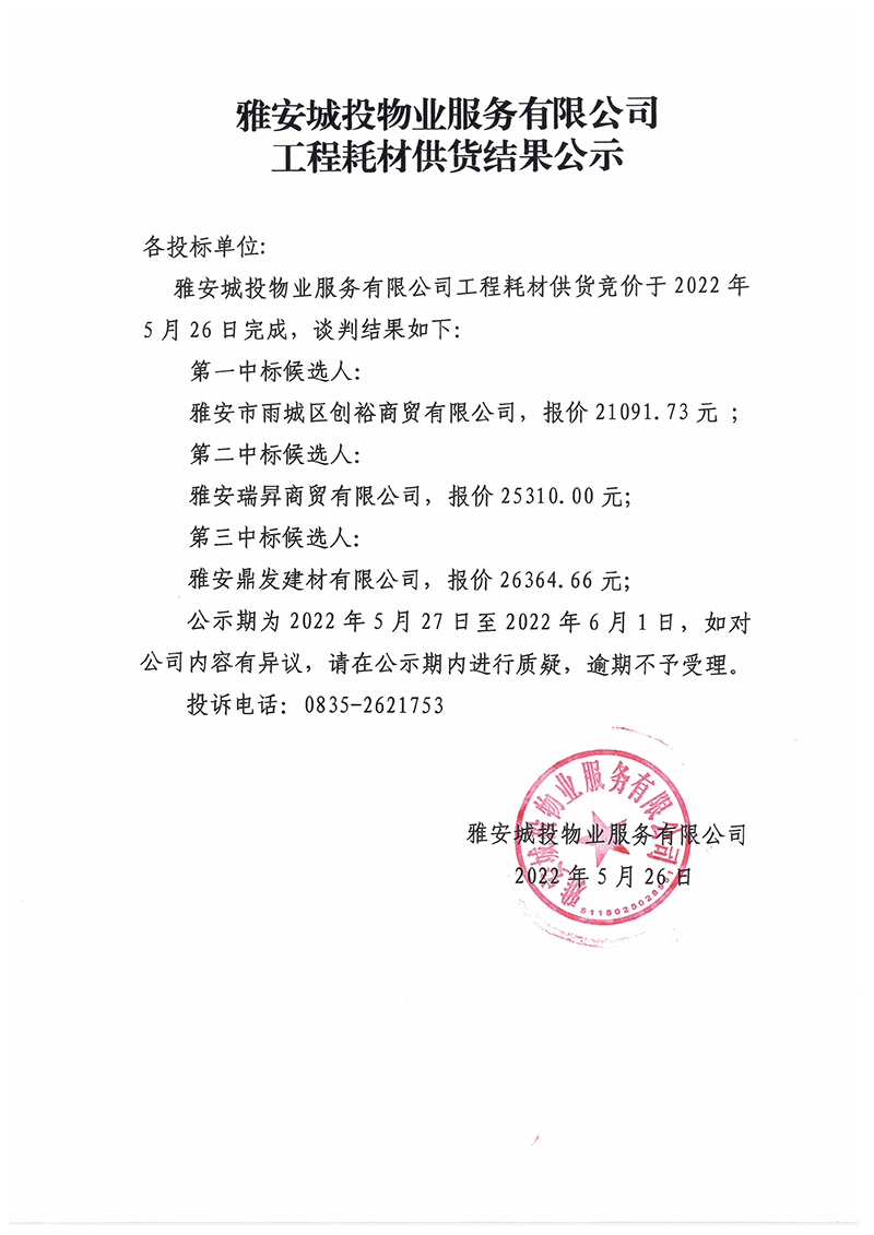 雅安城投物業(yè)服務有限公司工程耗材供貨結果公示