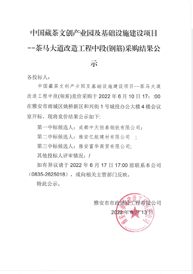 中國藏茶文創(chuàng)產(chǎn)業(yè)園及基礎設施建設項 茶馬大道改造工程中段鋼筋采購結果公示