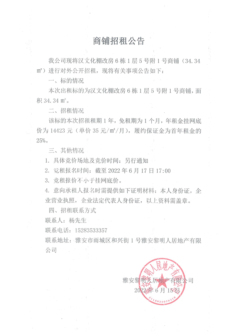 漢文化棚改房6棟1層5號(hào)附1號(hào)商鋪招租公告