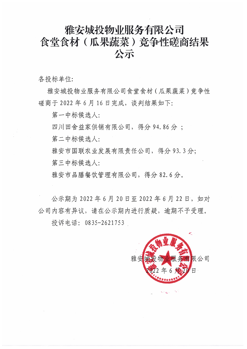 城投公司食堂食材(瓜果蔬菜)采購項(xiàng)目談判磋商結(jié)果公示