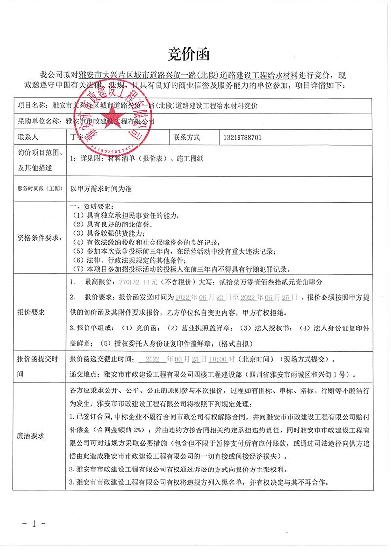 雅安市大興片區(qū)城市道路興貿(mào)一路(北段) 道路建設(shè)工程給水材料采購公告