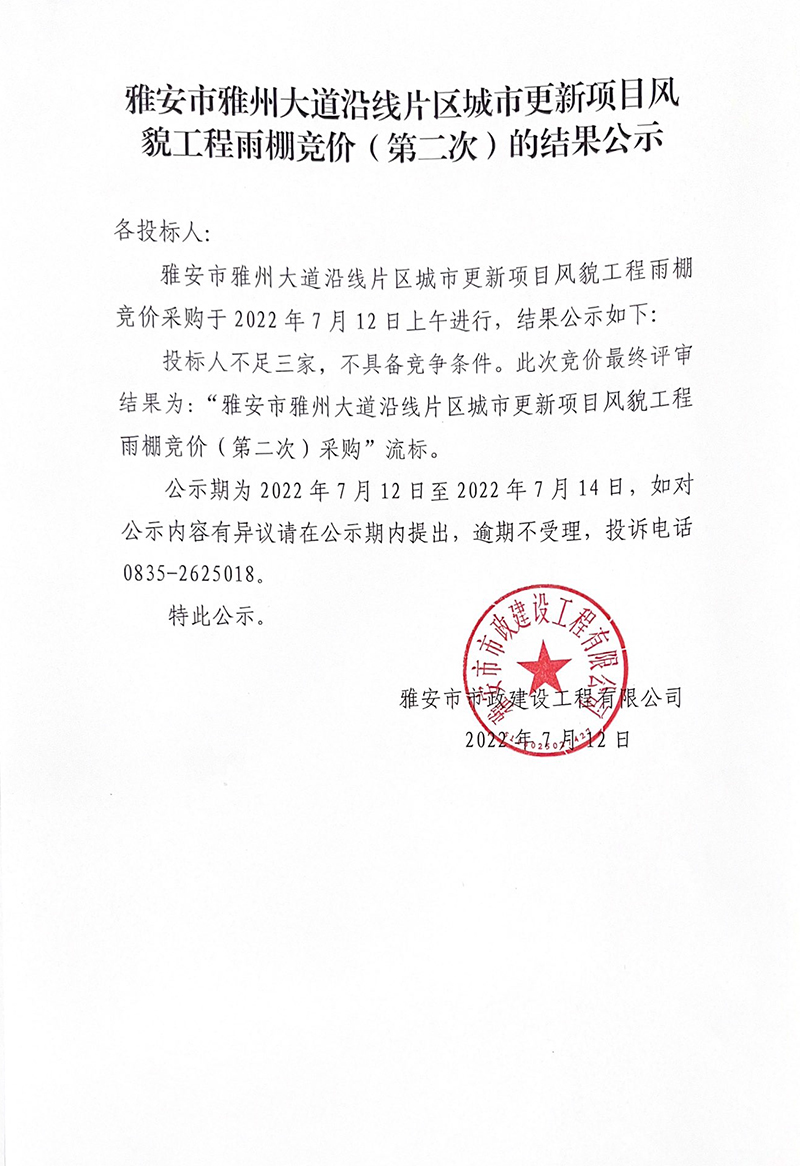 雅安市雅州大道沿線片區(qū)城市更新項(xiàng)目風(fēng)貌工程雨棚競(jìng)價(jià)(第二次)的結(jié)果公示