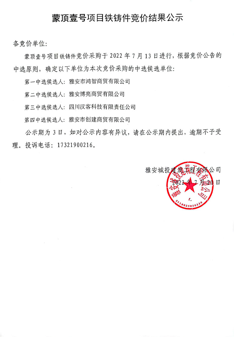蒙頂壹號(hào)項(xiàng)目鐵鑄件競價(jià)結(jié)果公示