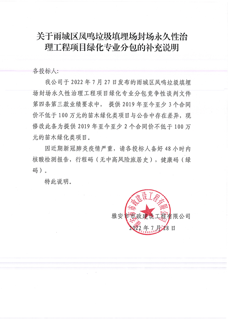 關(guān)于雨城區(qū)鳳鳴垃圾填埋場封場永久性治理工程項目綠化專業(yè)分包的補(bǔ)充說明