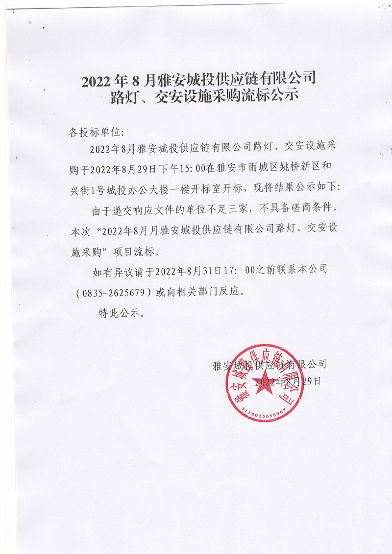 2022年8月雅安城投供應(yīng)鏈有限公司路燈、交安設(shè)施采購流標(biāo)公示