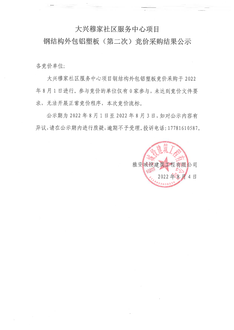 大興穆家社區(qū)服務(wù)中心項(xiàng)目鋼結(jié)構(gòu)外包鋁塑板(第二次)競價采購結(jié)果公示
