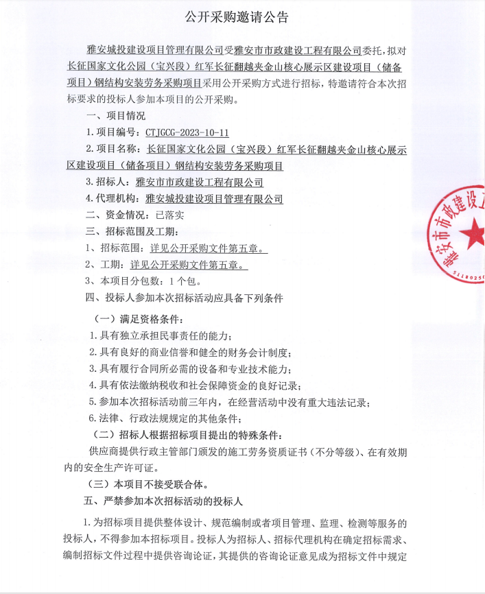 長(zhǎng)征國(guó)家文化公園(寶興段)紅軍長(zhǎng)征翻越夾金山核心展示區(qū)建設(shè)項(xiàng)目(儲(chǔ)備項(xiàng)目)鋼結(jié)構(gòu)安裝勞務(wù)采購(gòu)項(xiàng)目公開采購(gòu)邀請(qǐng)公告