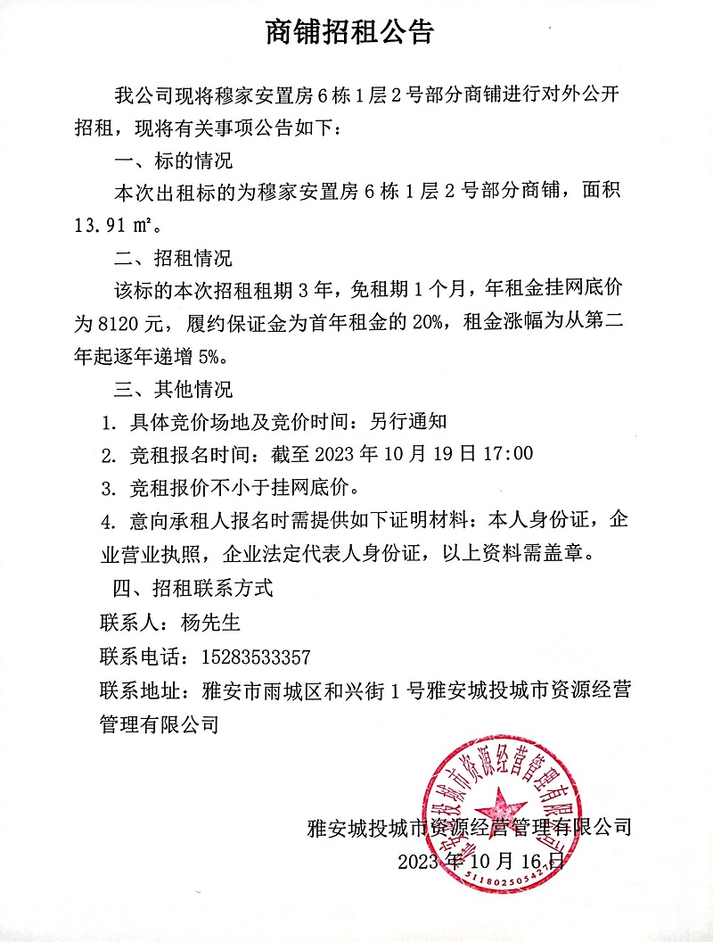 穆家安置房6棟1層2號部分商鋪招租公告