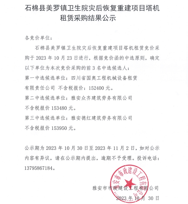 石棉縣美羅鎮(zhèn)衛(wèi)生院災(zāi)后恢復(fù)重建項目塔機租賃采購結(jié)果公示