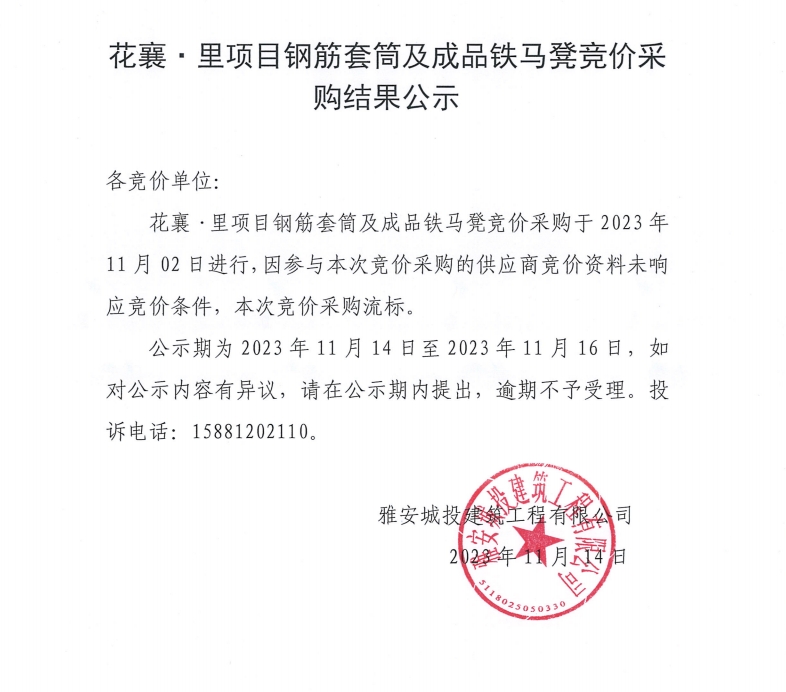 花襄·里鋼筋套筒及成品鐵馬凳競價采購結(jié)果公示