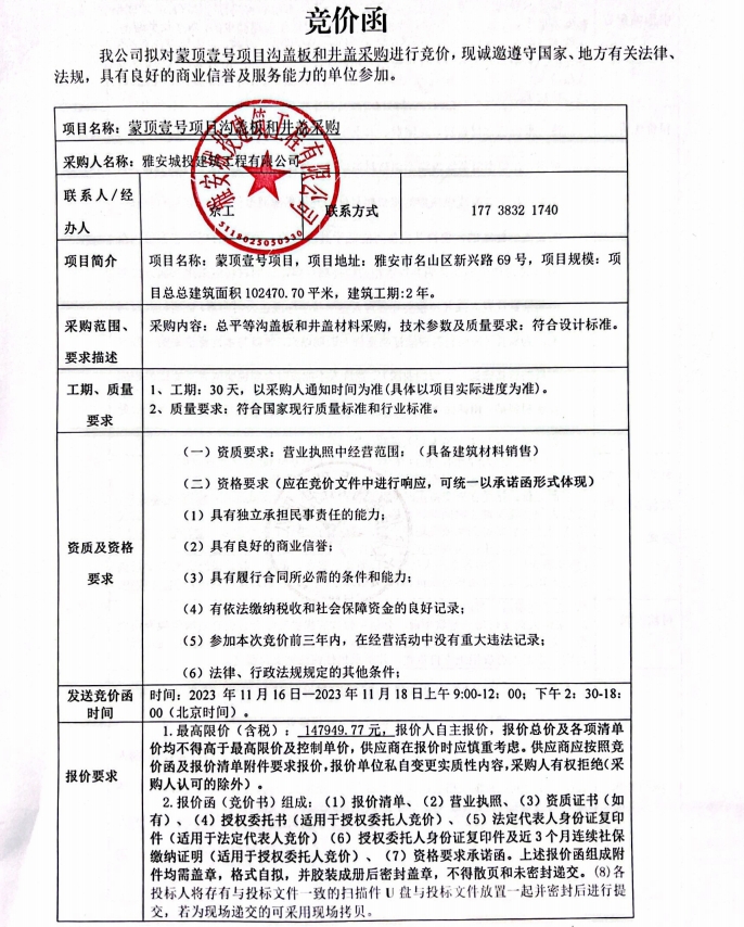 蒙頂壹號(hào)項(xiàng)目溝蓋板和井蓋采購競價(jià)公告