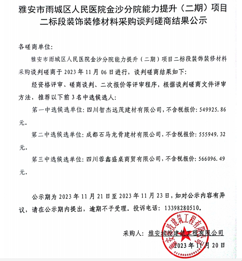 雅安市雨城區(qū)人民醫(yī)院金沙分院能力提升(二期)項(xiàng)目二標(biāo)段裝飾裝修材料采購(gòu)談判磋商結(jié)果公示