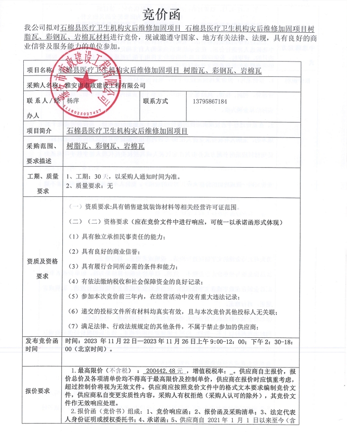 石棉縣醫(yī)療衛(wèi)生機構災后維修加固改造項目采購樹脂瓦、彩鋼瓦、巖棉瓦材料競價公告