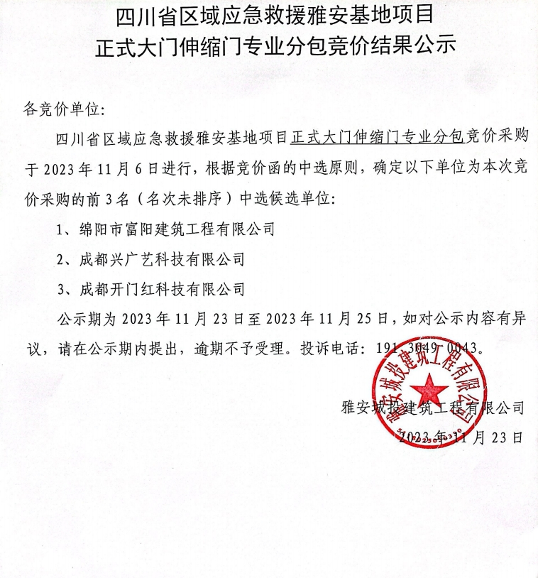 四川省區(qū)域應(yīng)急救援雅安基地項(xiàng)目正式大門伸縮門專業(yè)分包競價(jià)結(jié)果公示